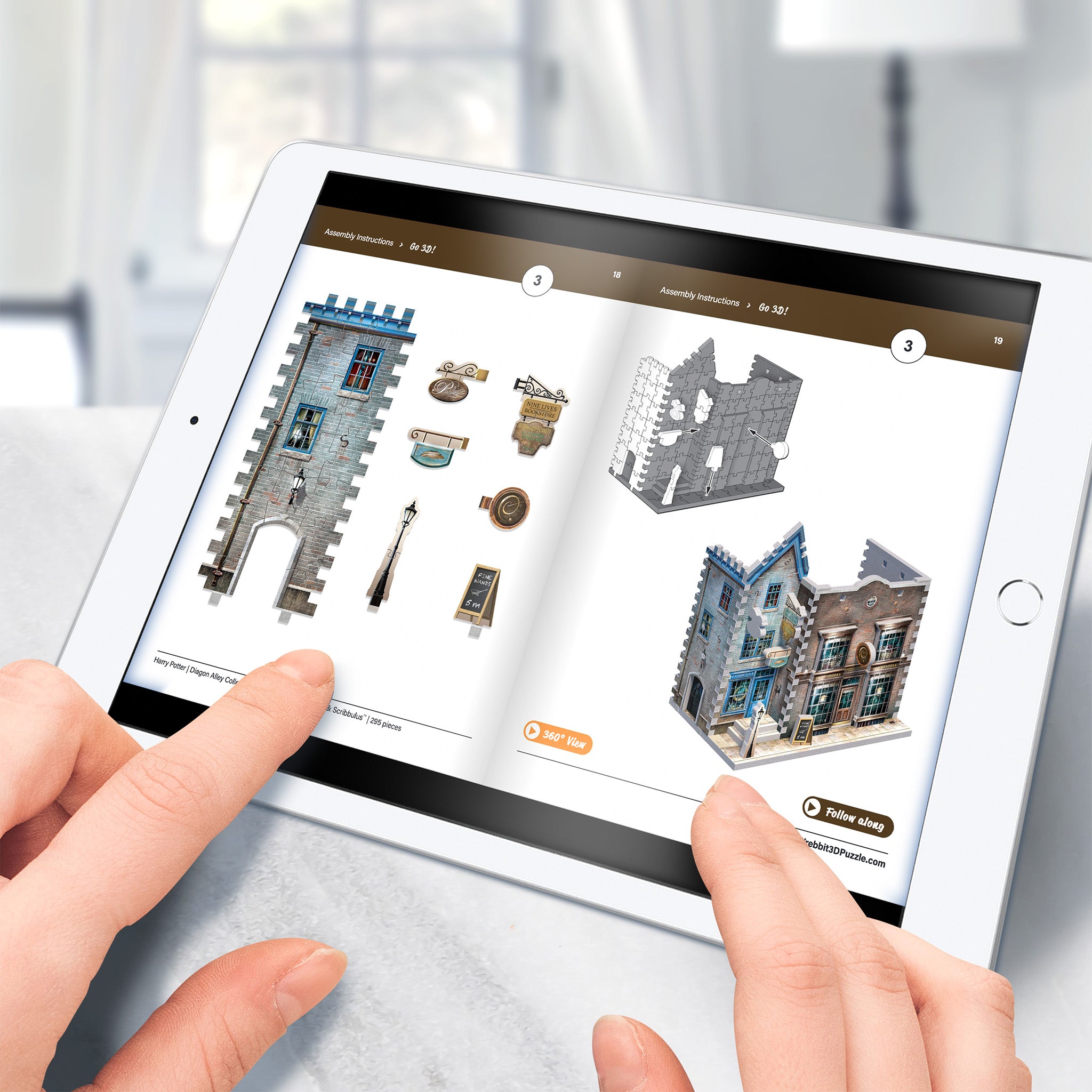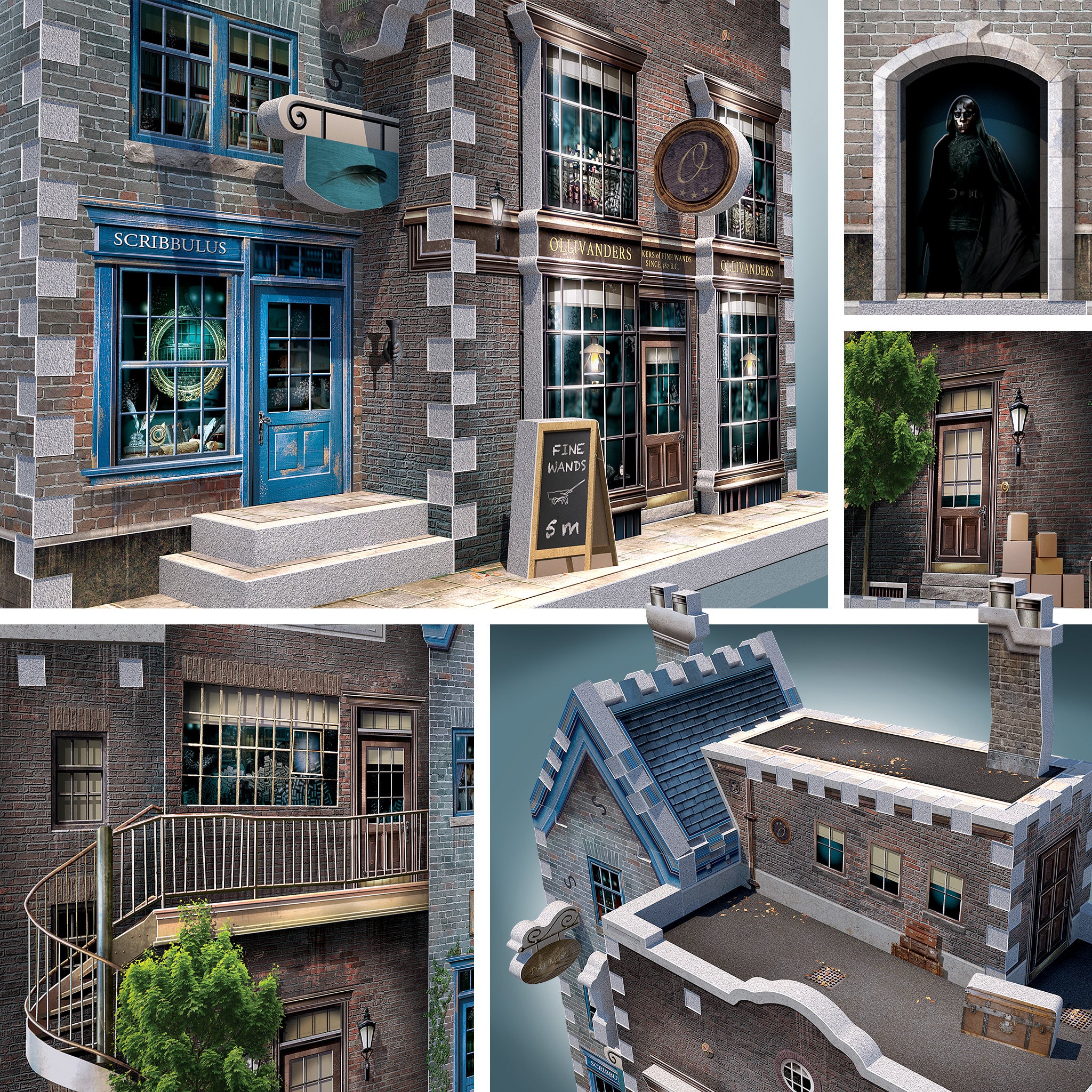 Take your previously assembled sections and panels, build the Ollivander's Wand Shop™️ and Scribbulus™️ in 3D and display your achievement proudly!
