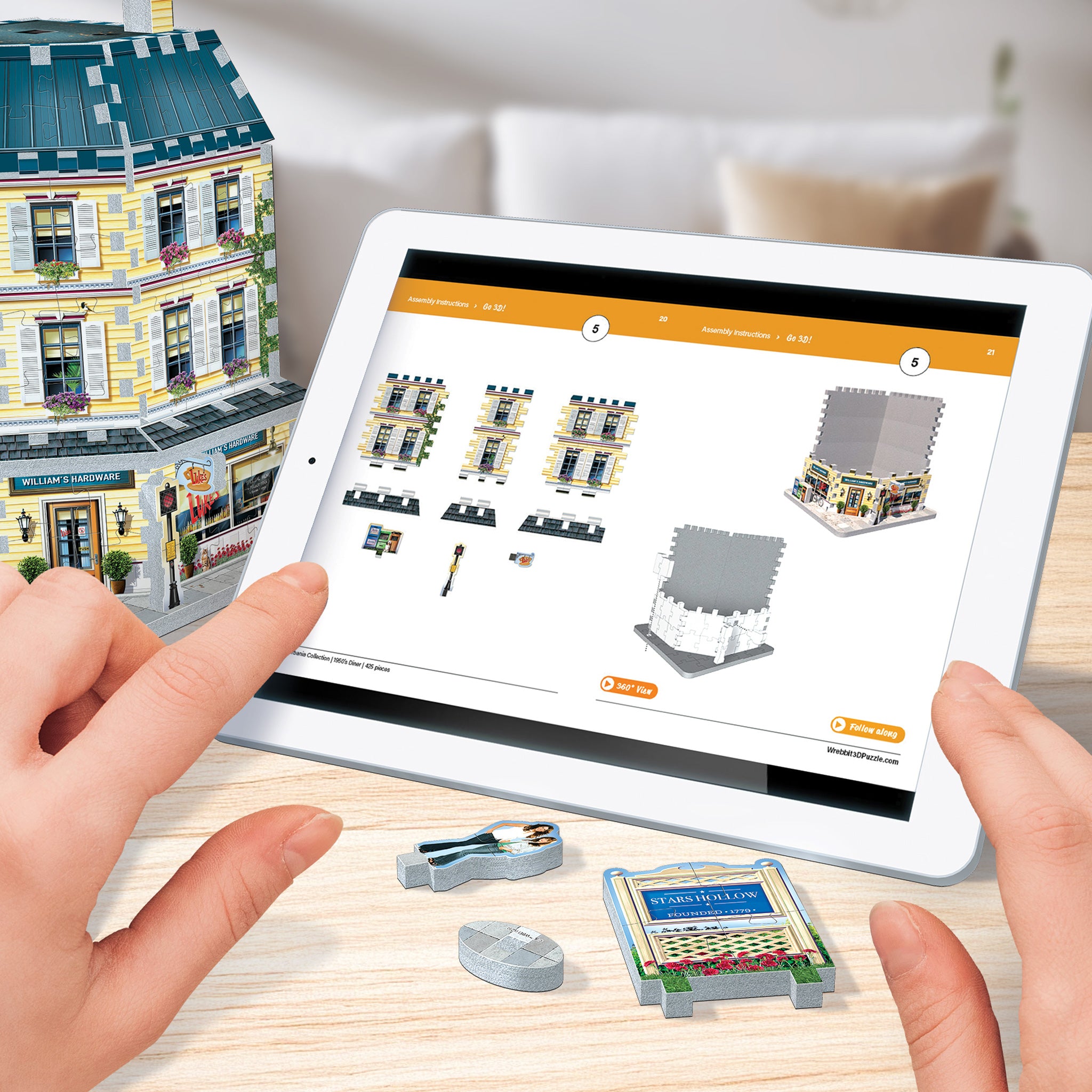 Take your previously assembled sections and panels, build the Stars Hollow in 3D and display your achievement proudly!